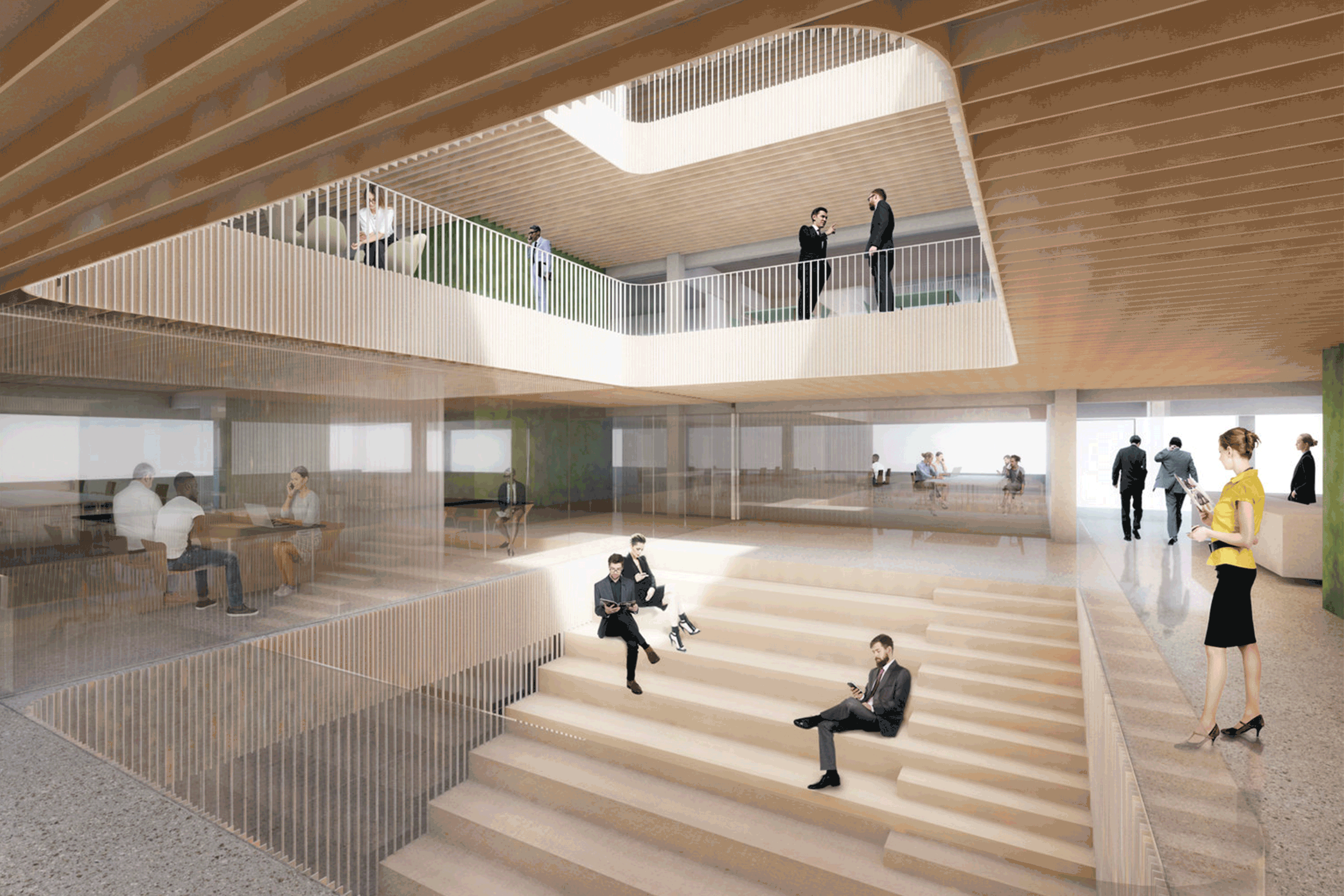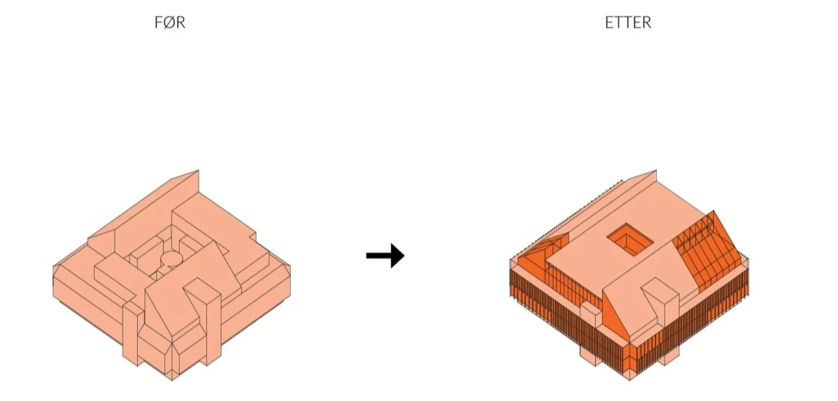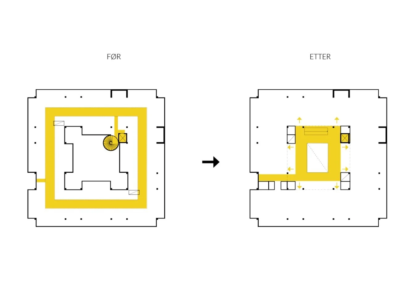 Kontorbygningen har i alle år vært «pakket inn» innvendig med nedforede himlinger, fullt av lettvegger og skreddersydde tekniske løsninger og cellekontorer. Nye eiere ønsket en full rehabilitering og rommene ble strippet slik at betongen ble synlig og takhøyden maksimert. Vesentlig for konseptet er «Sentralrommet», et nytt «bygg i bygget» som tar hånd om all teknisk infrastruktur, sirkulasjon og alle fellesarealer. Prikken over i-en ble de nye takarealene – identitetsskapende rom og med en utrolig utsikt – som en gest til Aases ikoniske kontorbygning fra 1978 .